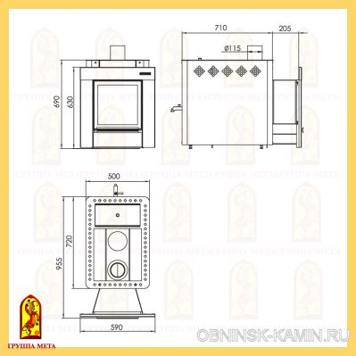 Объём парной: 8-16 м3 Диам.дымохода: 115 мм Глубина: 955 мм. Ширина: 585 мм. Высота: 690 мм. Масса печи: 107 кг. Масса камней: 50 кг. Объем бака для воды: 30 л.